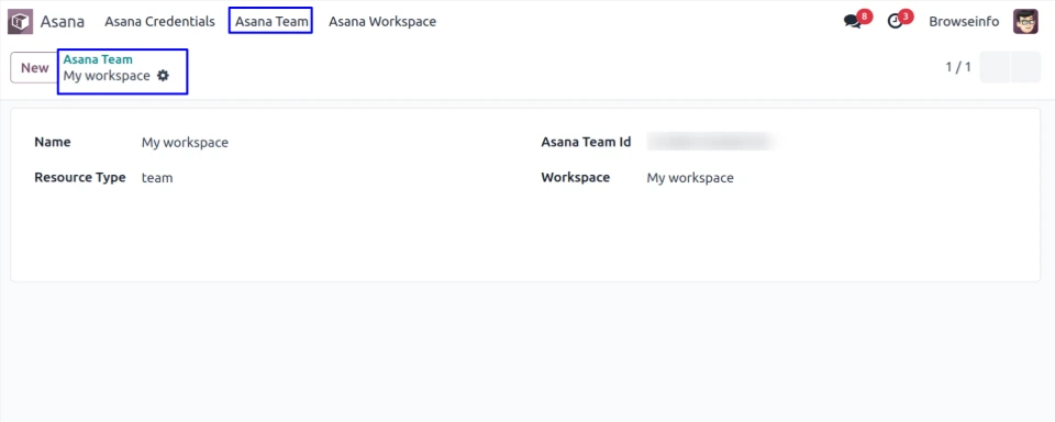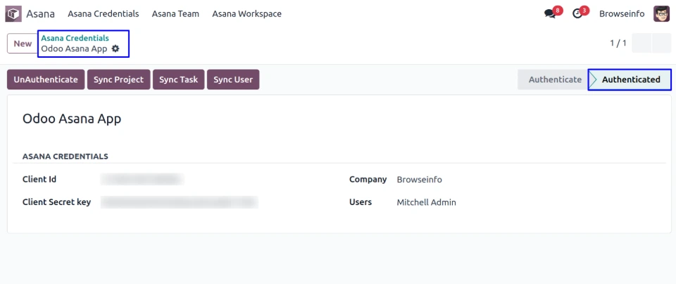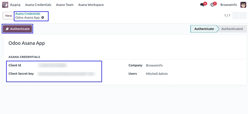 User can create a new Asana Instance by clicking on the New button. Here User need to add their Client id, Client Secret Key and click on "Authenticate" button.