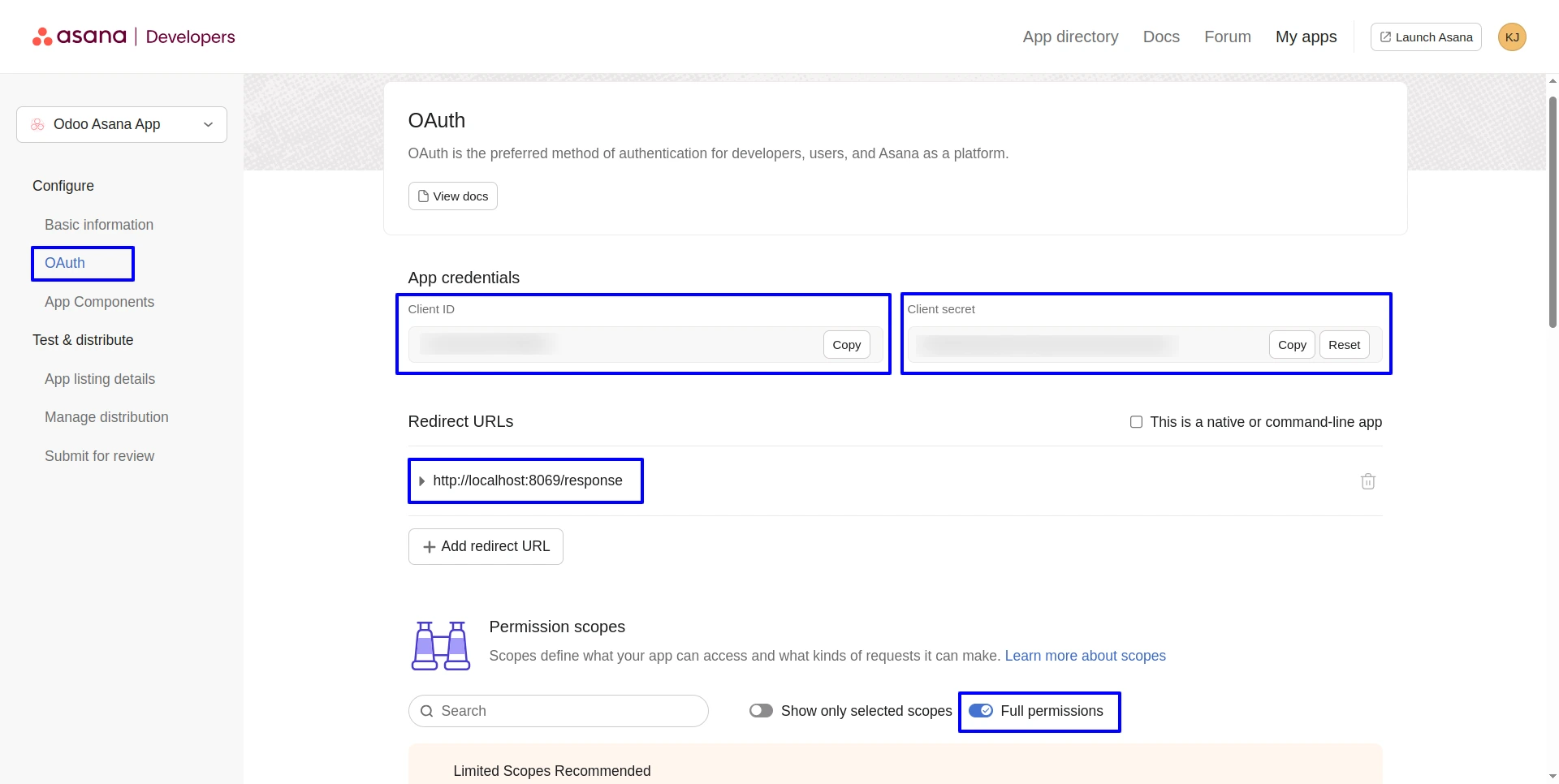 Clicking on OAuth and use the given credentials to connect Asana with Odoo. Add Odoo server’s redirect URL and enable "Full Permissions" to give full permissions in Asana.