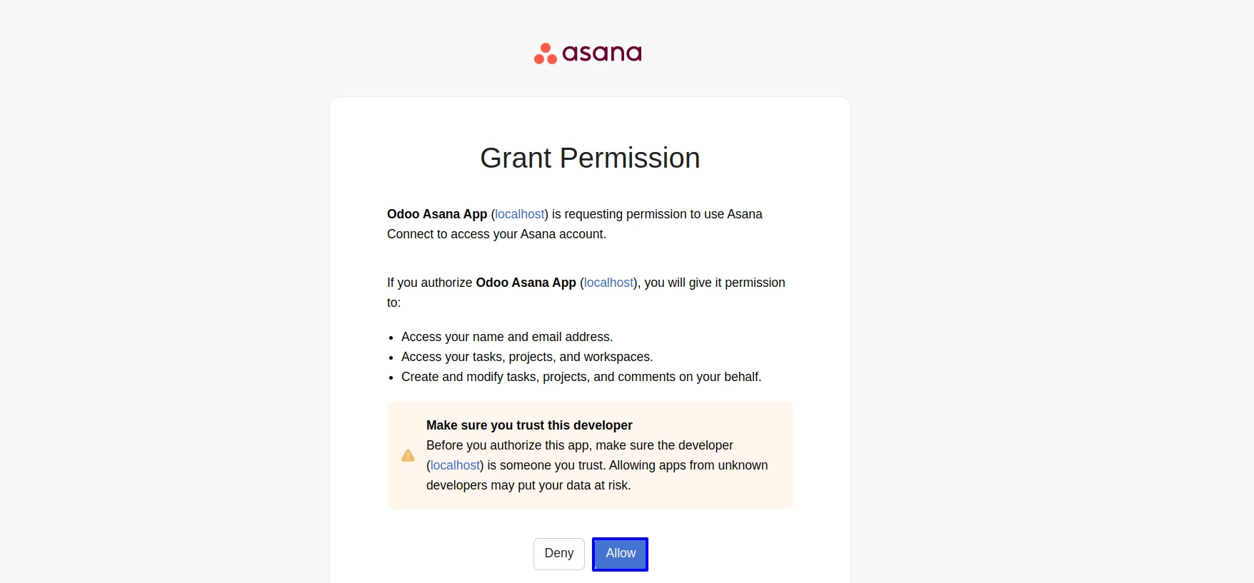 Clicking on "Authenticate" user will be redirected to Asana access page where user need to click on Allow button.