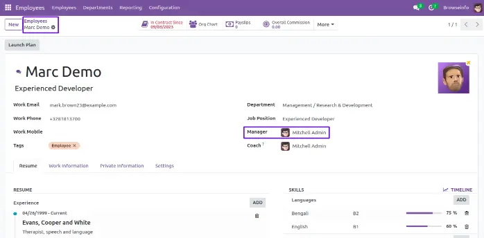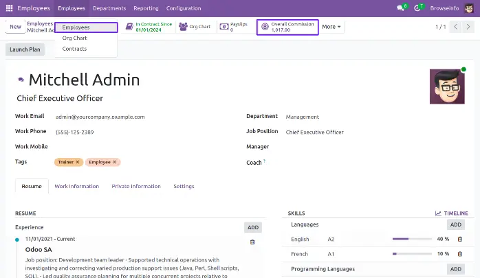 A quick overview of individual performance is provided by displaying the overall sales commission within the employee's form view.