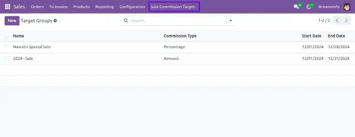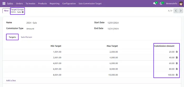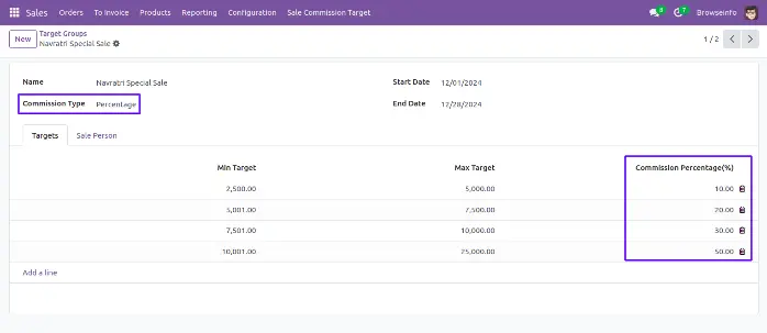 Users can establish sales commission target groups based on both amount and percentage, providing a flexible commission structure.
