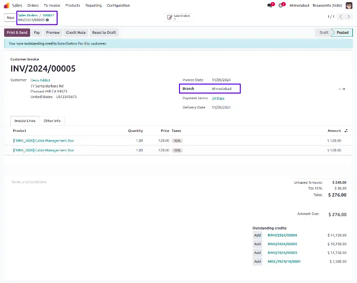 After Validate invoice, Selected branch of the invoice will automatically set on Journal Items.