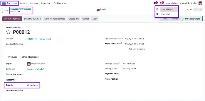 While bill created from the purchase order selected branch of the purchase order will automatically set on vendor bill.