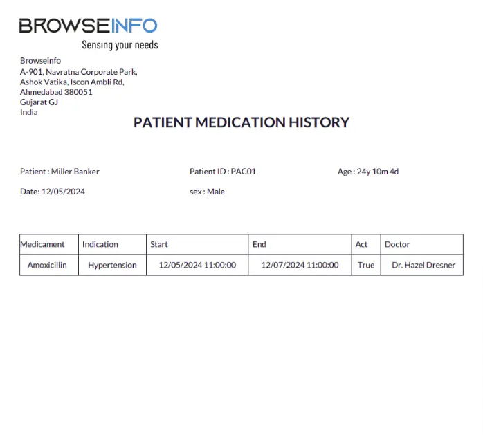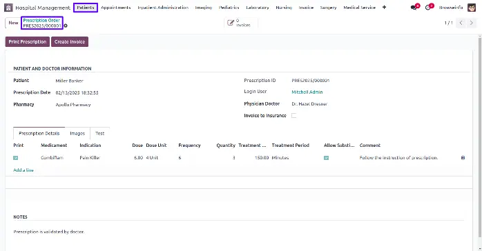 In Hospital Management > Patient > Prescription menu user can create a prescription for the patient, user can enter the details of the prescribed medicament, its dosage, and other details.