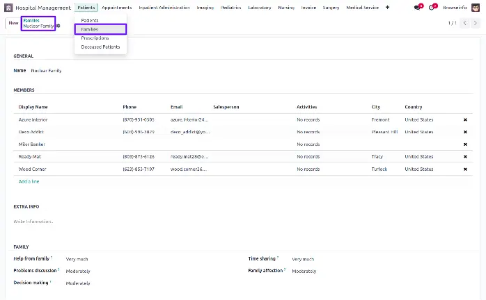 In Hospital Management > Patient > Families menu users can create and enter the family members and their contact details for future reference to contact them in case of emergency.