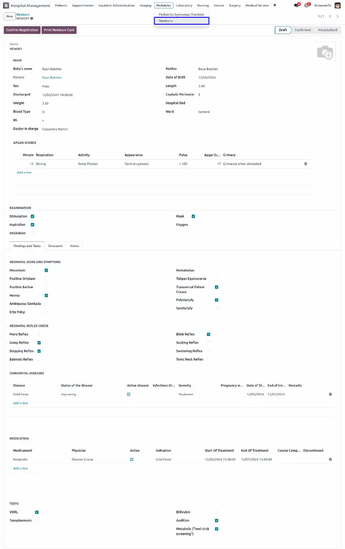 In Hospital Management > Pediatrics > Newborn menu users can create and manage newborns, and enter all the necessary details about newborns. like main details, APGAR score, reanimation, neonatal signs and symptoms, neonatal reflex check, congenital diseases, medication, and test details.
