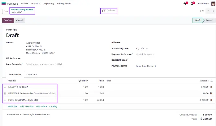 - Single Invoice from Multiple Purchase Orders: Users can consolidate multiple purchase orders into a single invoice, streamlining the billing process for greater efficiency.
