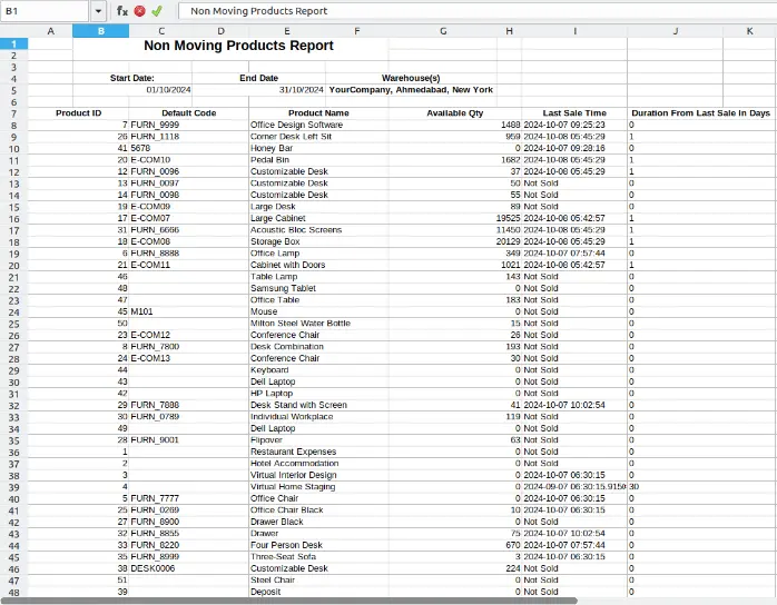 Easily get details how many products are unsold(non moving) even it is available in stock according to specific warehouse and specific duration.