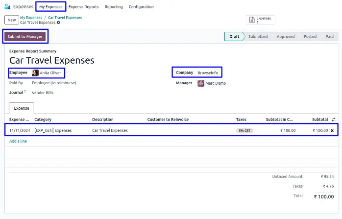 Users are required to fill in necessary expense details and request approval from their designated manager, simplifying and standardizing the approval process.