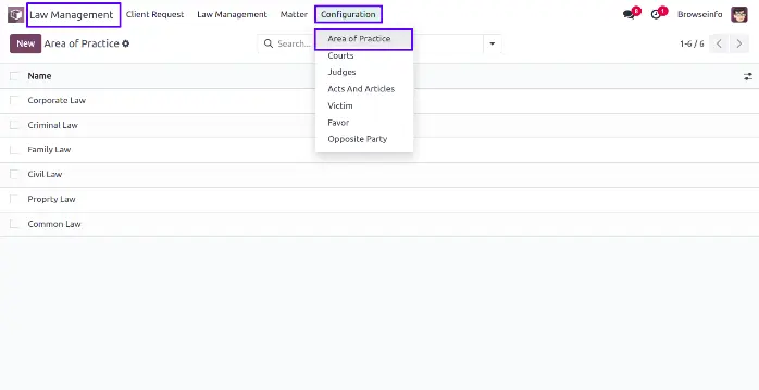 Under Law Management > Configuration > Area of Practice menu law administrator can configure area of practice.