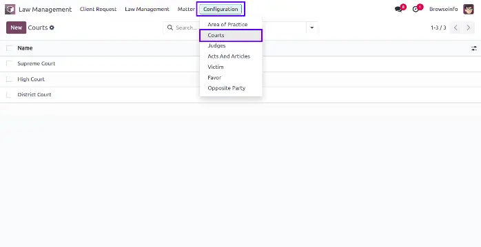 Under Law Management > Configuration > Courts menu law administrator can configure different courts.