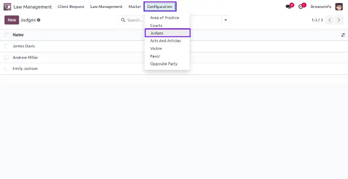 Under Law Management > Configuration > Judges menu law administrator can configure different judges.