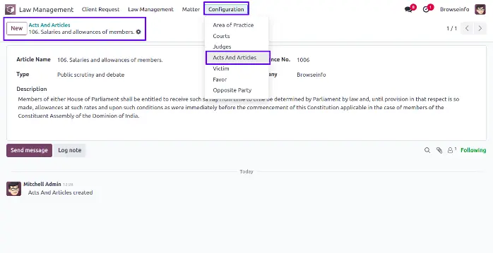 Under Law Management > Configuration > Acts And Articles menu law administrator can configure multiple acts and articles.
