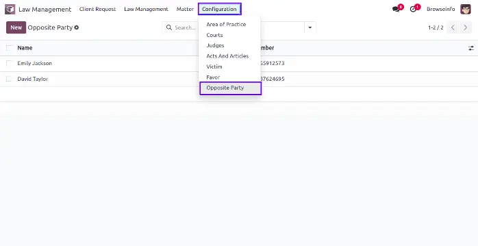 Under Law Management > Configuration > Opposite Party menu law administrator can create and manage opposite party.