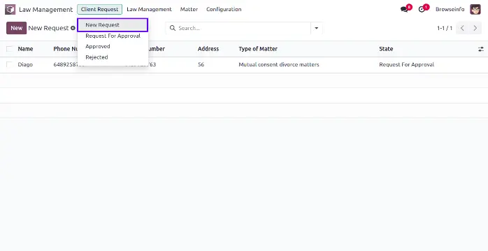 Under Law Management > Client Request > New Request menu user can see and create new request.