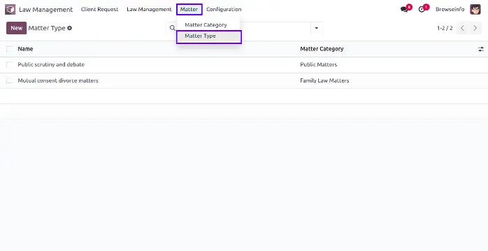 Under Law Management > Configuration > Matter Type menu law administrator can configure different matter type.