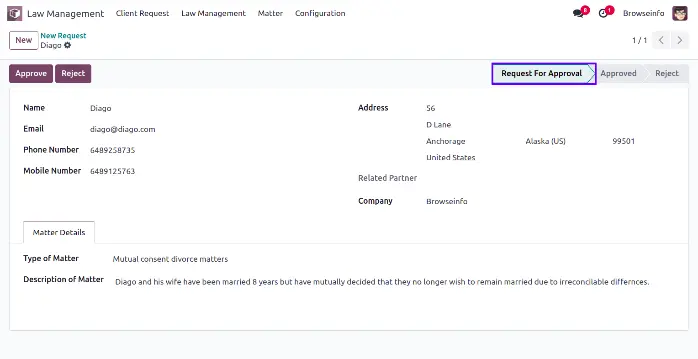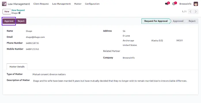 Under Law Management > Client Request > Request For Approval menu law manager can see and approve client request by clicking "APPROVE" button.