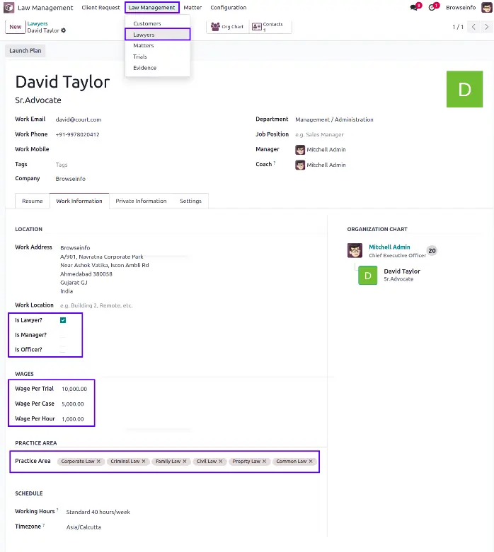 User need to enable "Is Lawyer" option, and configure "Wage Per Trial, Wage Per Case, Wage Per Hour, Also configure "Practice Area".