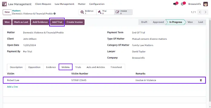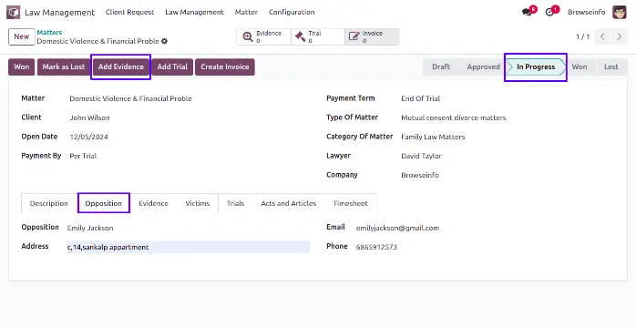 User can add matter description, opposition, evidence, victims, trials, act and also can add timesheet.