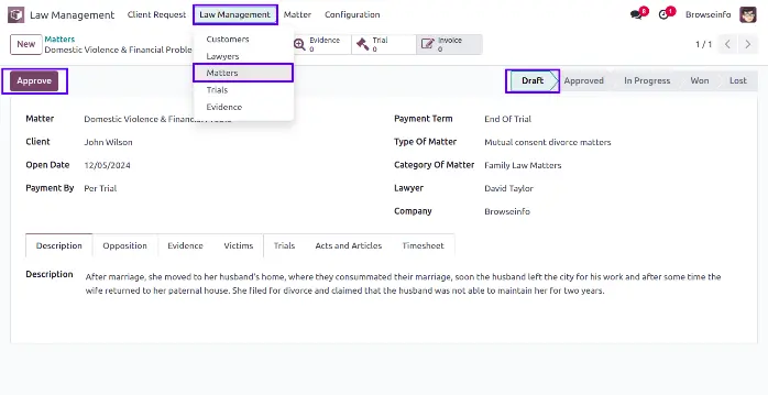 Under Law Management > Law Management > Matters menu law user can create and manage matters, Click "APPROVE" button to approve matter.