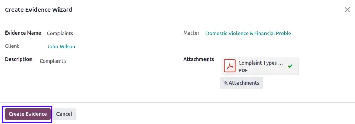 User need to click "ADD EVIDENCE" button to add matter evidence, User can also create evidence under Law Management > Law Management > Evidence menu.