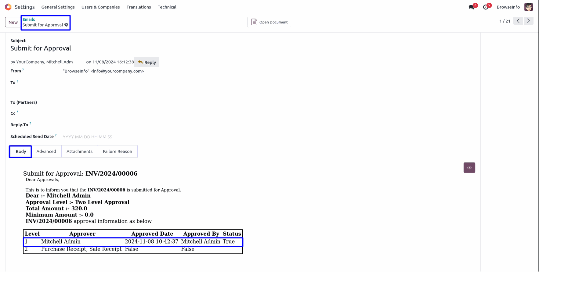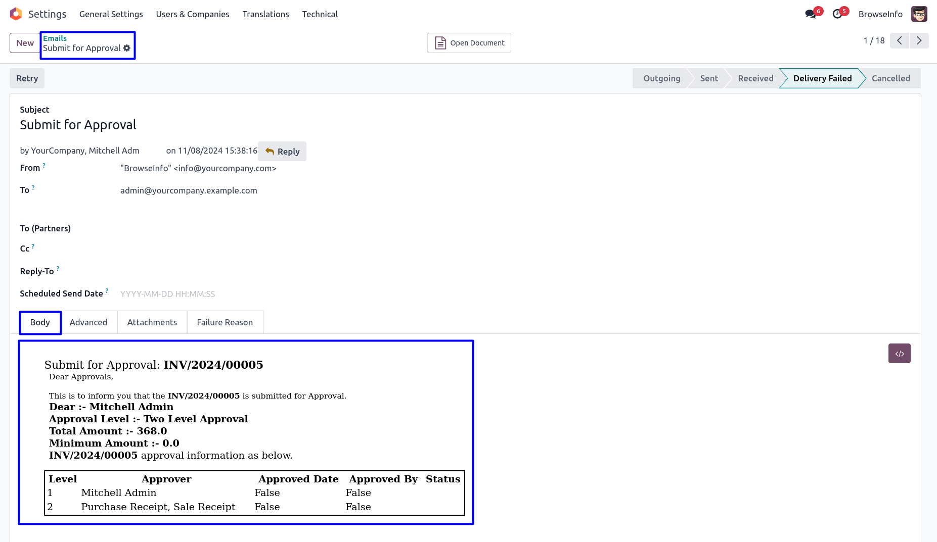 User will get email notification for approval and rejection of customer invoice and vendor bill.