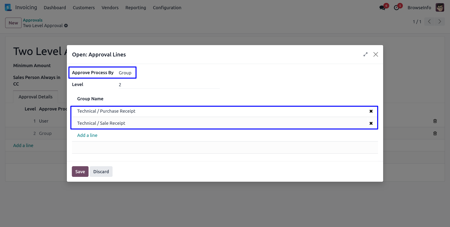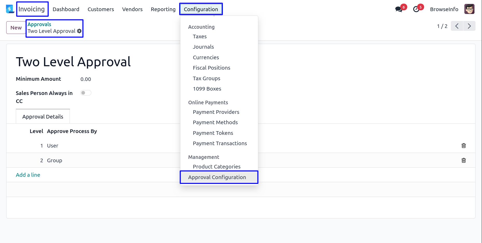 User can select approval process by 'Group' and define group name to approved an invoice by specific group users.