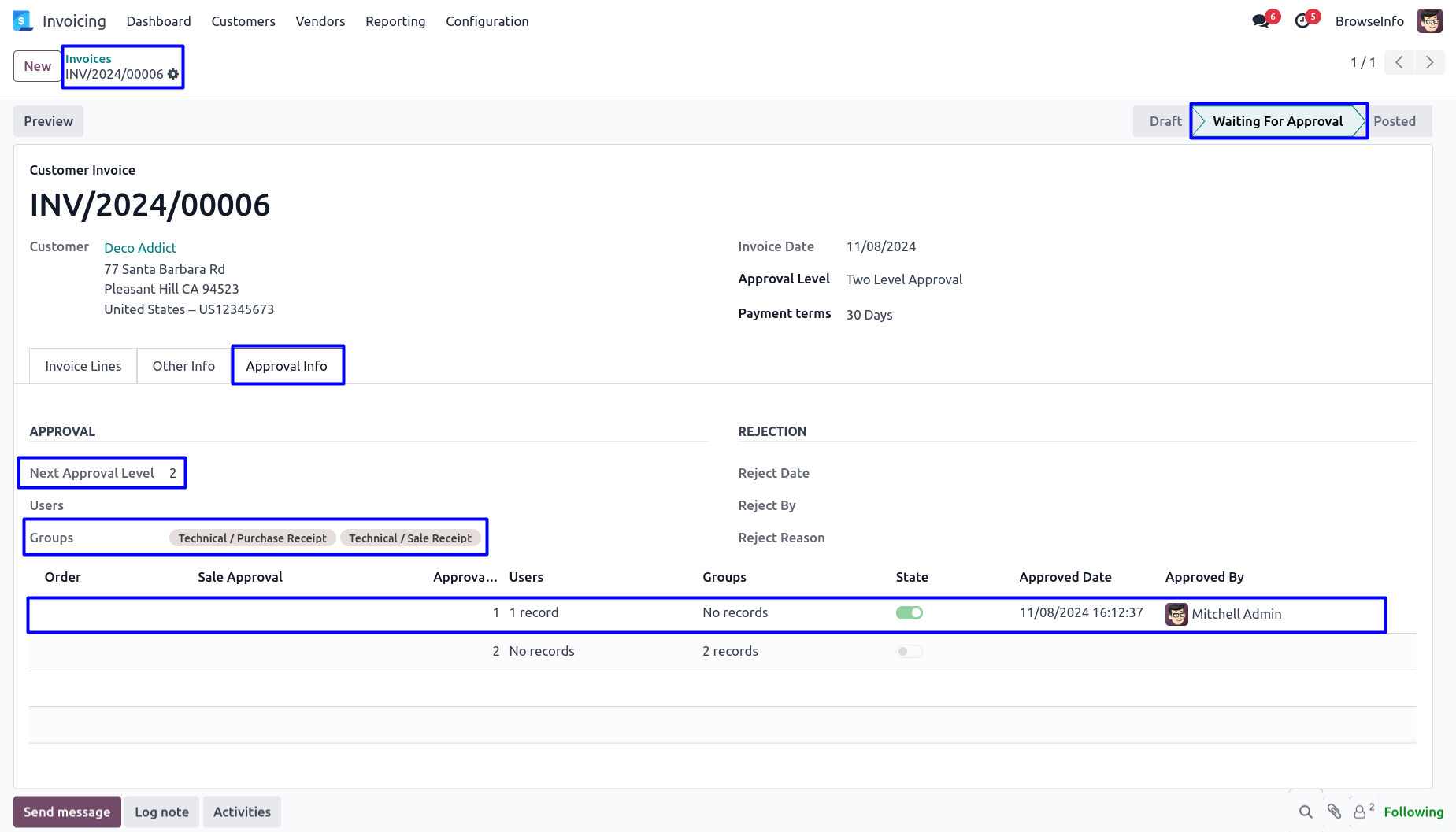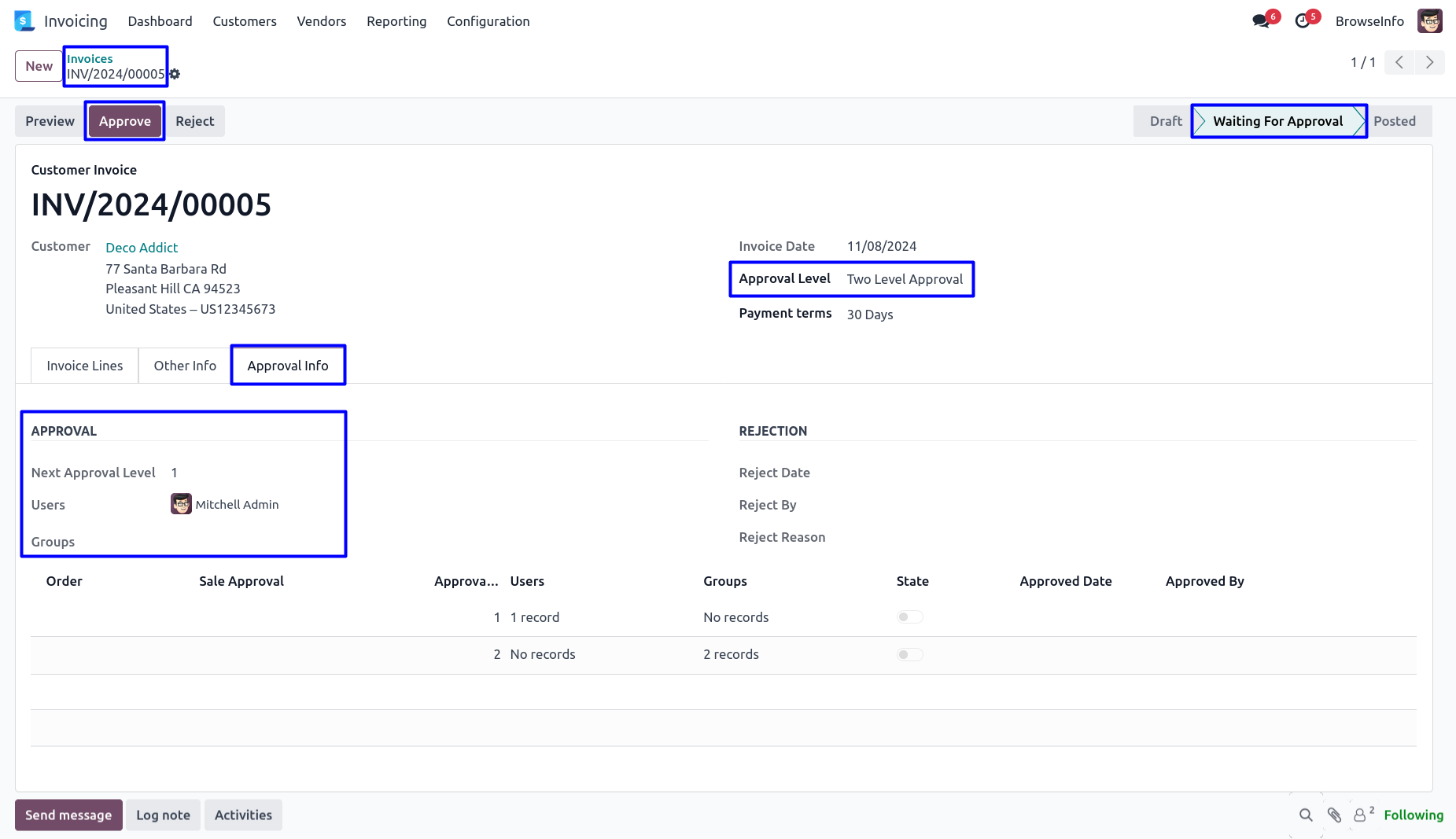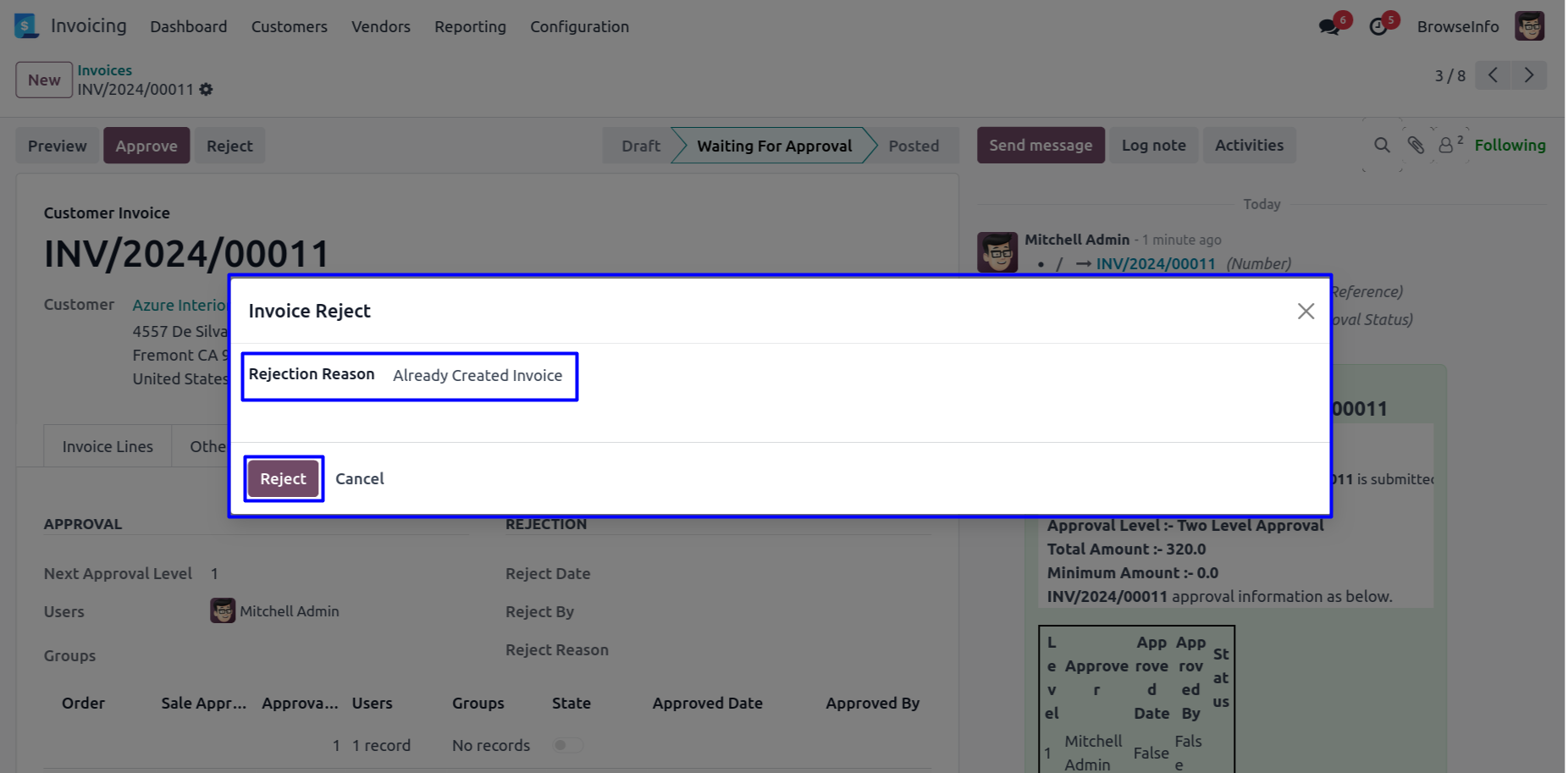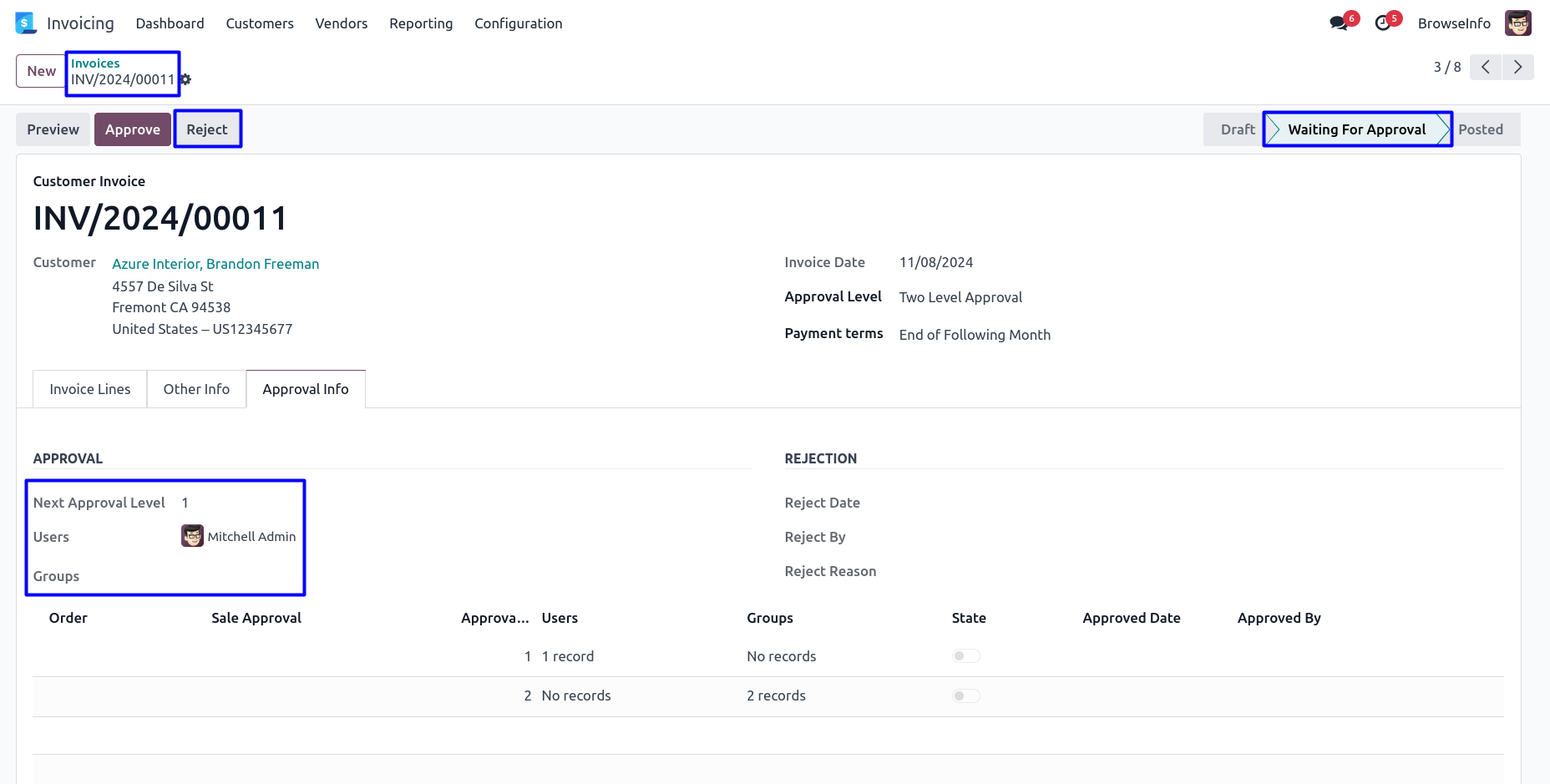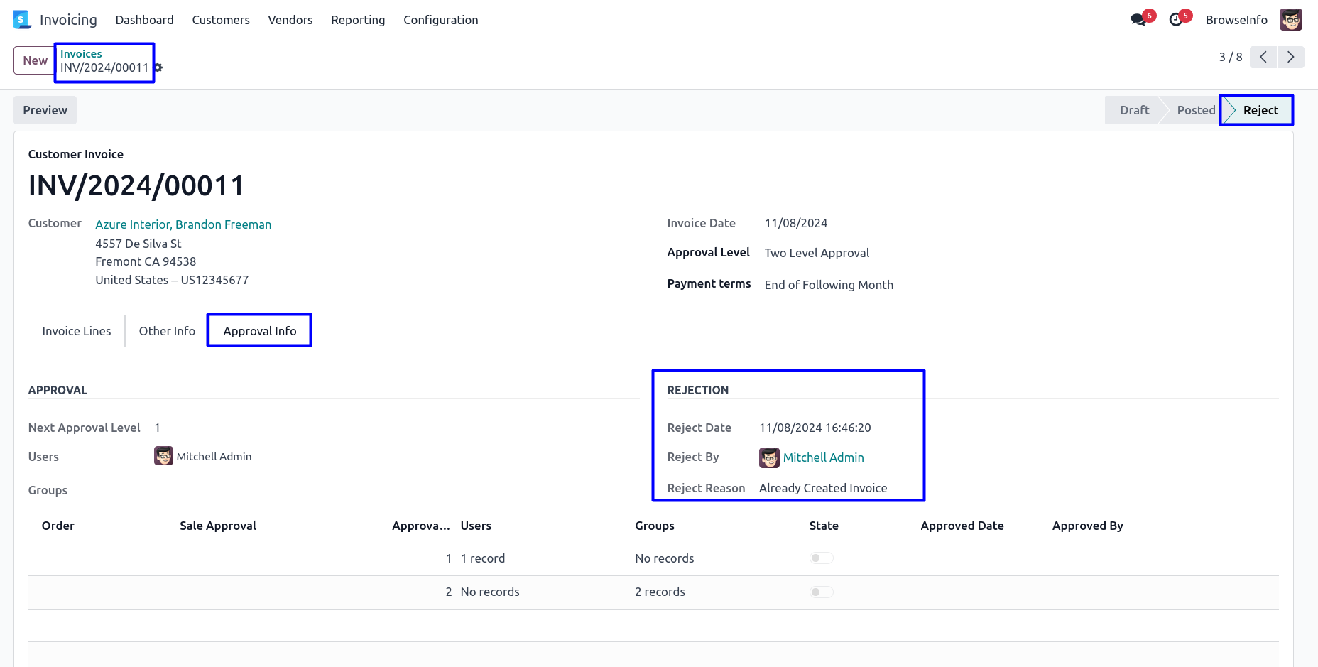 After rejected customer invoice by approver, Customer invoice moved to 'Reject' stage and no more approvals needed. User can view rejection information under 'Approval Info' tab.