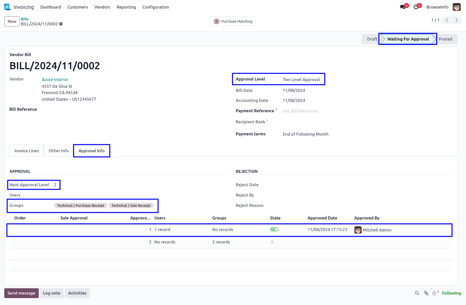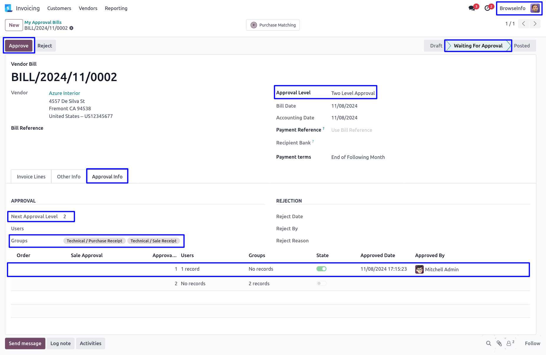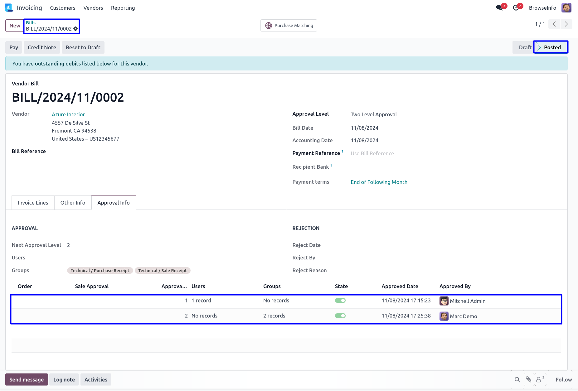 Once approved vendor bill by second approver, Confirmed vendor bill and view the details of approvers under 'Approval Info' tab.