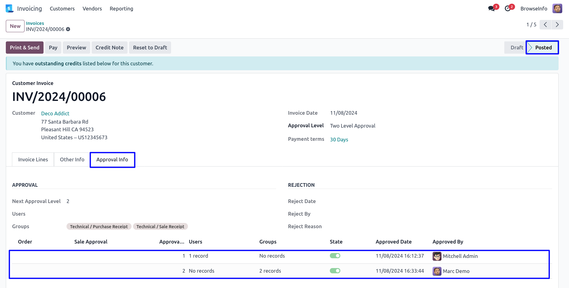 Once approved customer invoice by second approver, Confirmed customer invoice and view the details of approvers under 'Approval Info' tab.