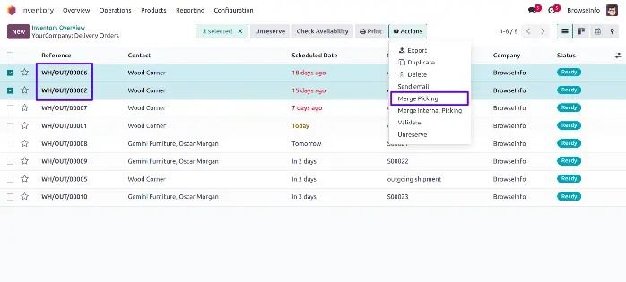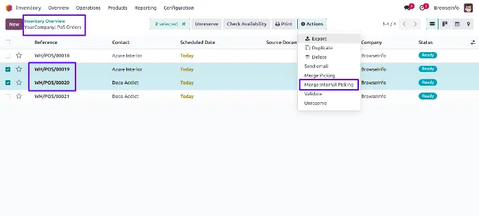 User have to select picking orders in tree views, Under "Action" menu user can see "Merge Picking" menu.