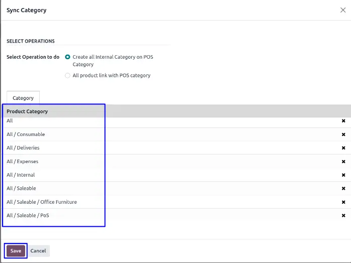 Select "Create all Internal Category on POS Category" operation then you can see list of categories.