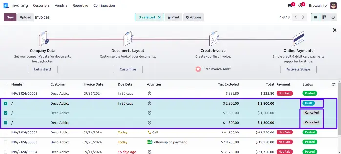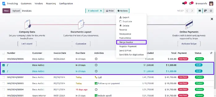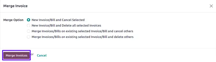On merge invoice wizard user have to select "New Invoice/Bill and Cancel Selected" options and click on "MERGE INVOICES" button.