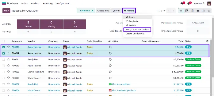 On purchase order tree view user have to select purchase orders and under "Action" menu user can see "Merge Purchase Orders" menu.