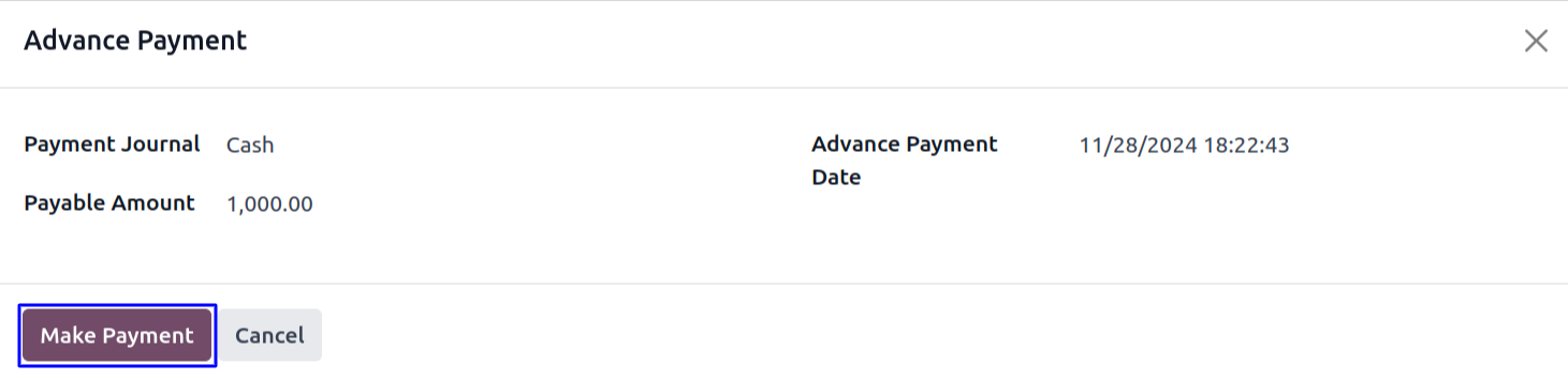 When click on advance payment button, Advance payment wizard open and select payment journal with payable amount and click on make payment button.