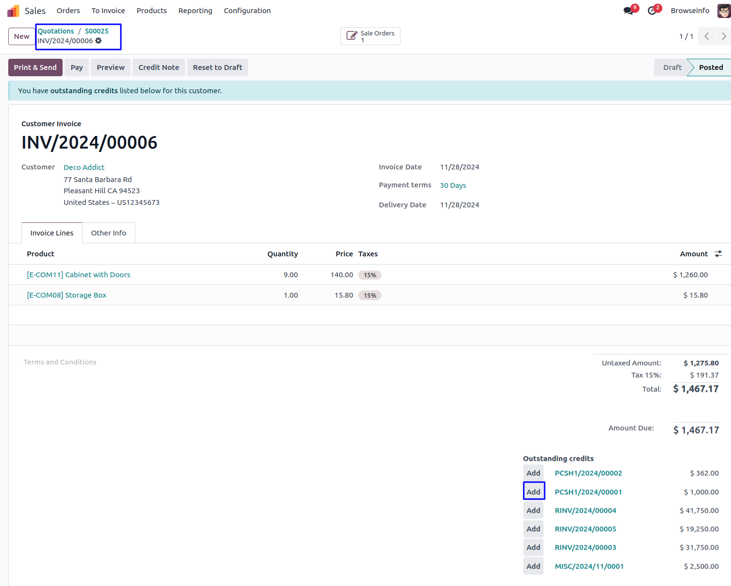 Under customer invoice you can see advance payment transfer in outstanding credits balance and click on add button for make payment.