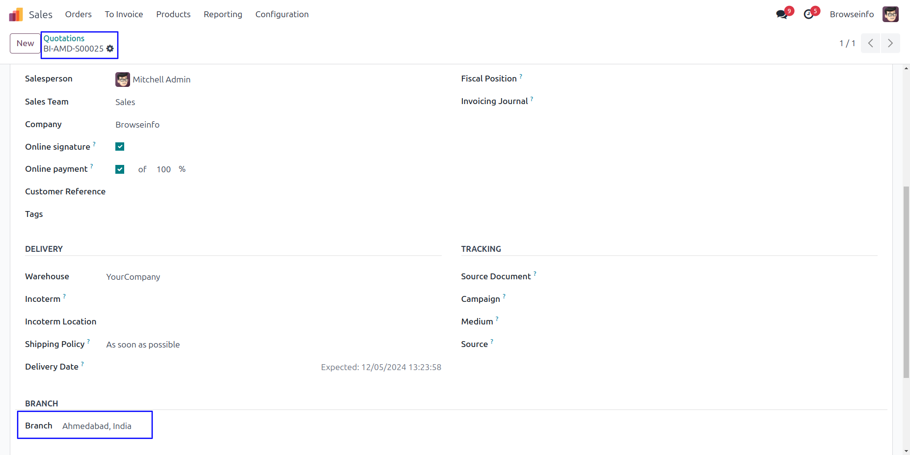 While creating sales order user who is currently login, branch of the user is set as branch to the sales order and warehouse shipment address is also set according to selected branch, also sequence number for sales order is based on branch.