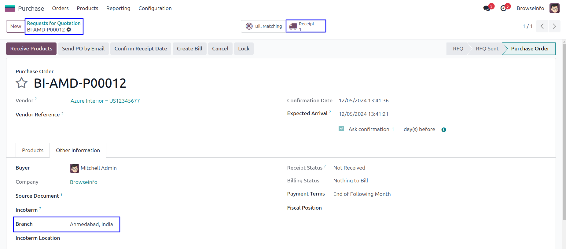 While creating purchase order user who is currently login, branch of the user is set as branch to the purchase order, Also selected branch prefix applied to purchase order.