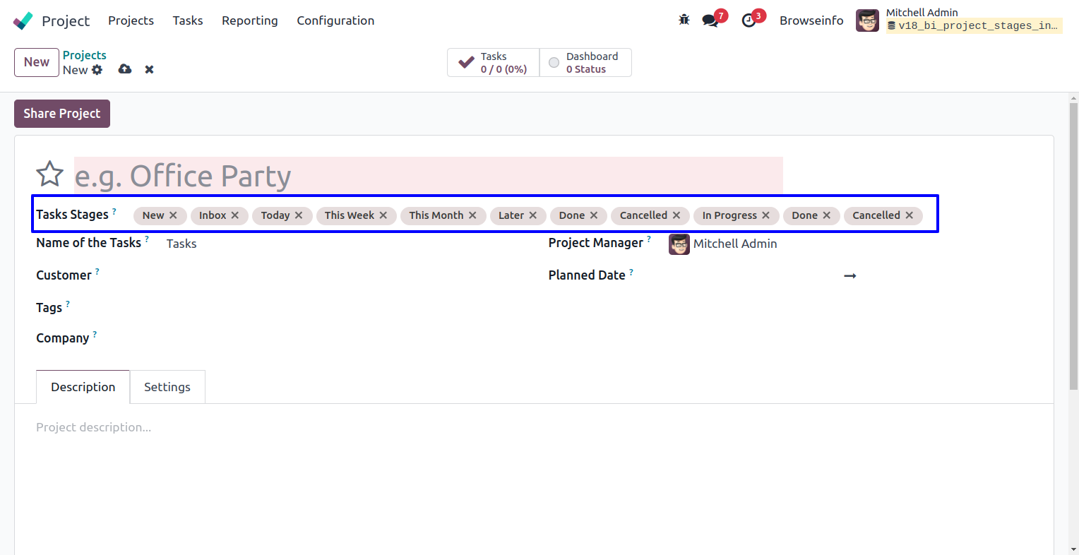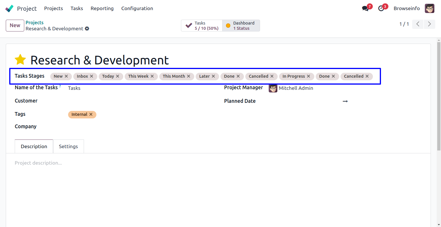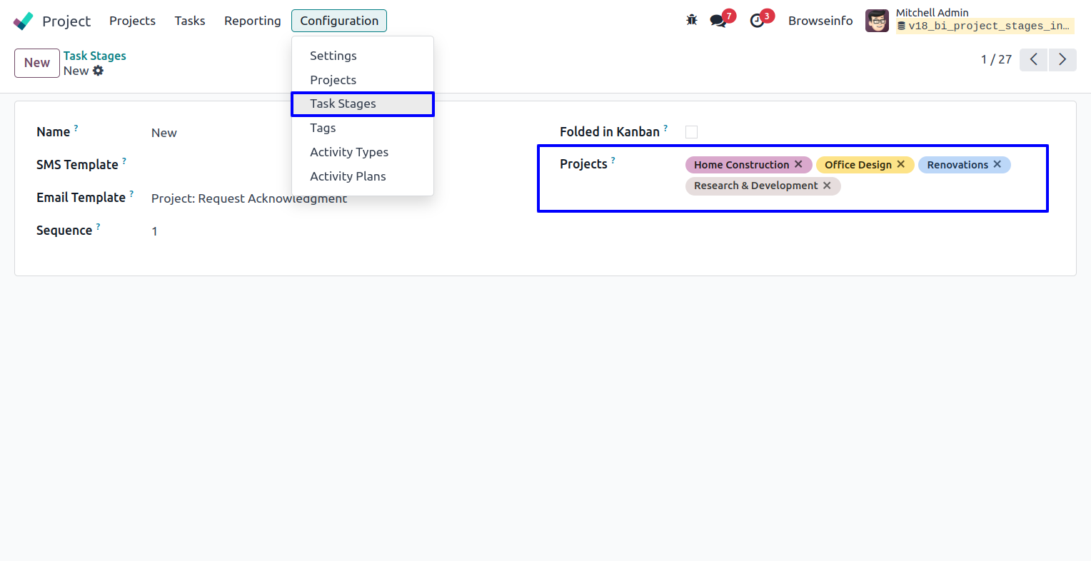 In default odoo we don't have functionality to select and use same stages on multiple project. Advance Project Stage Organiser odoo app helps user to set only selected stages for project, user can select multiple stages and only this selected stages will appear to related project, if user removes stages from project, project will also removed from stages, User can also share same stages on multiple projects.