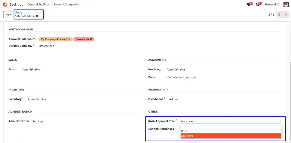 Under user configuration set RMA approval role as 'User' and 'Approver'.