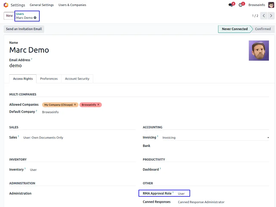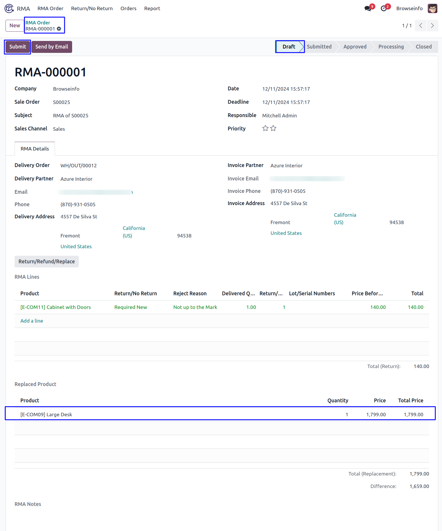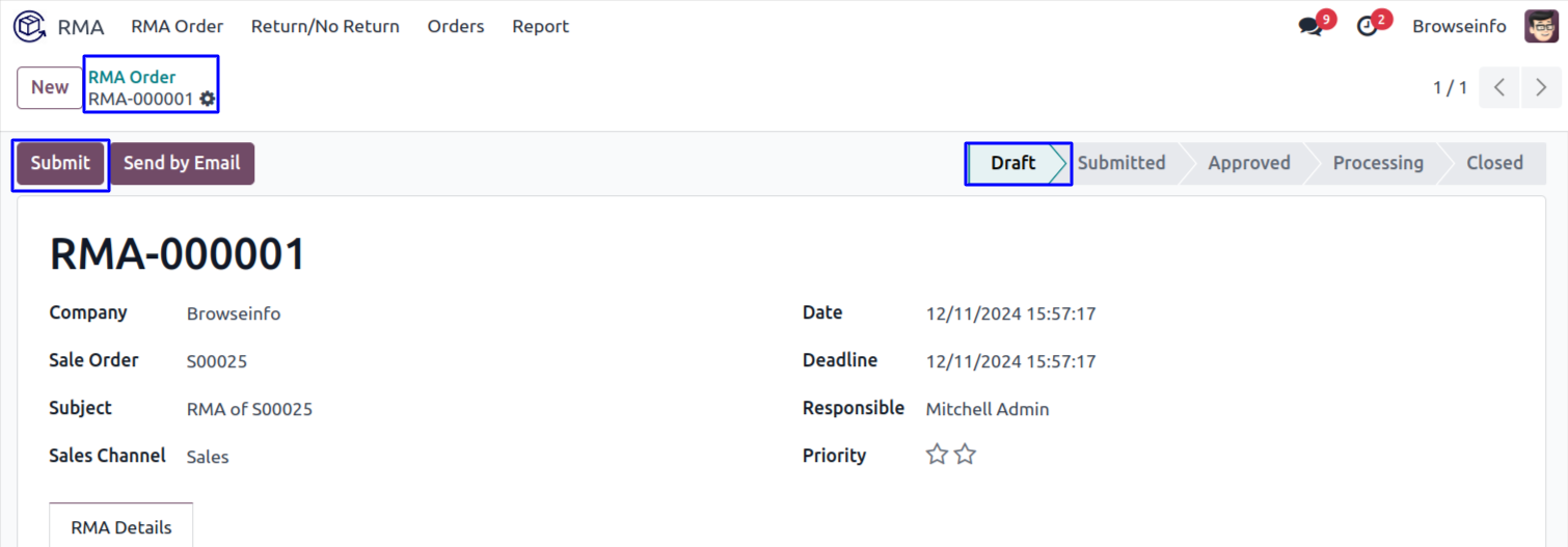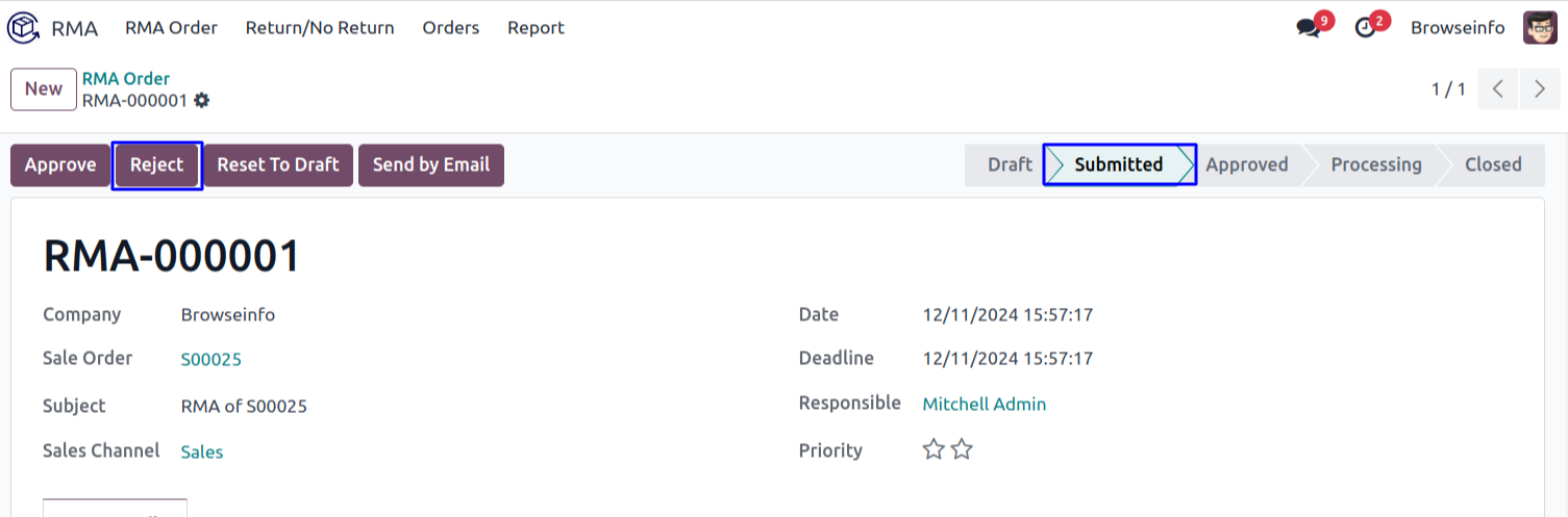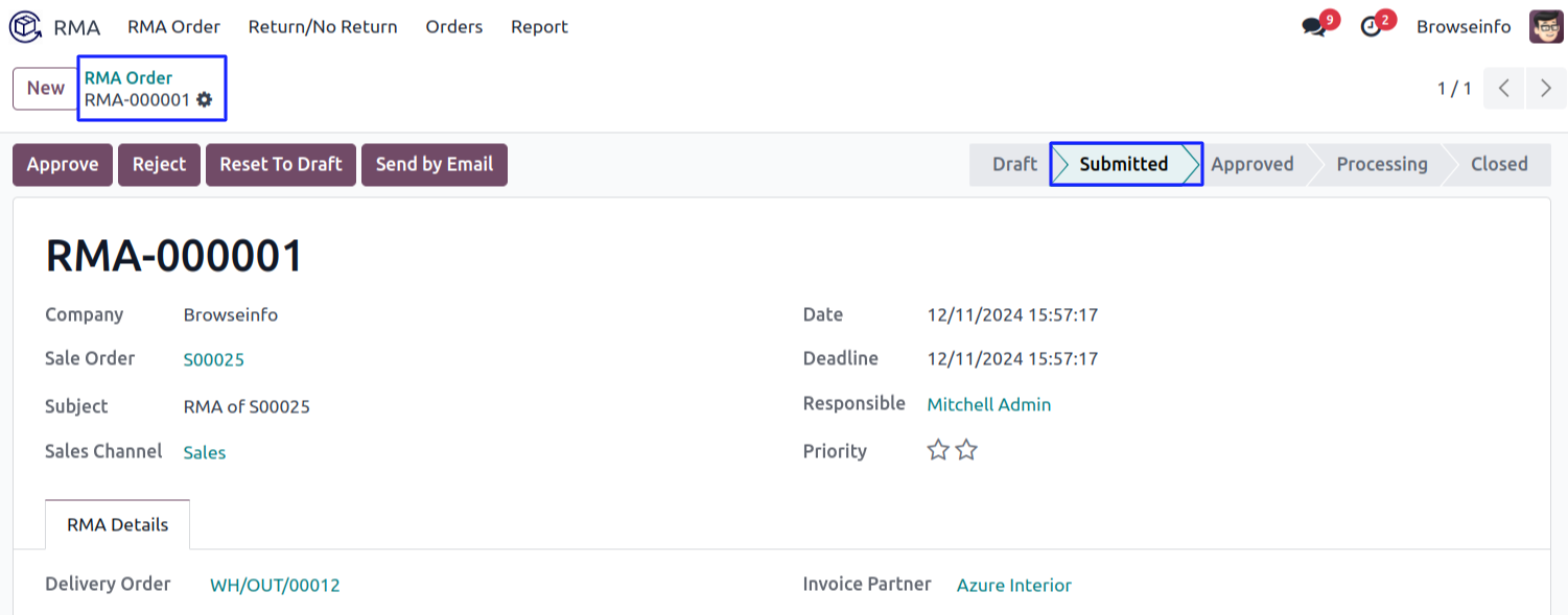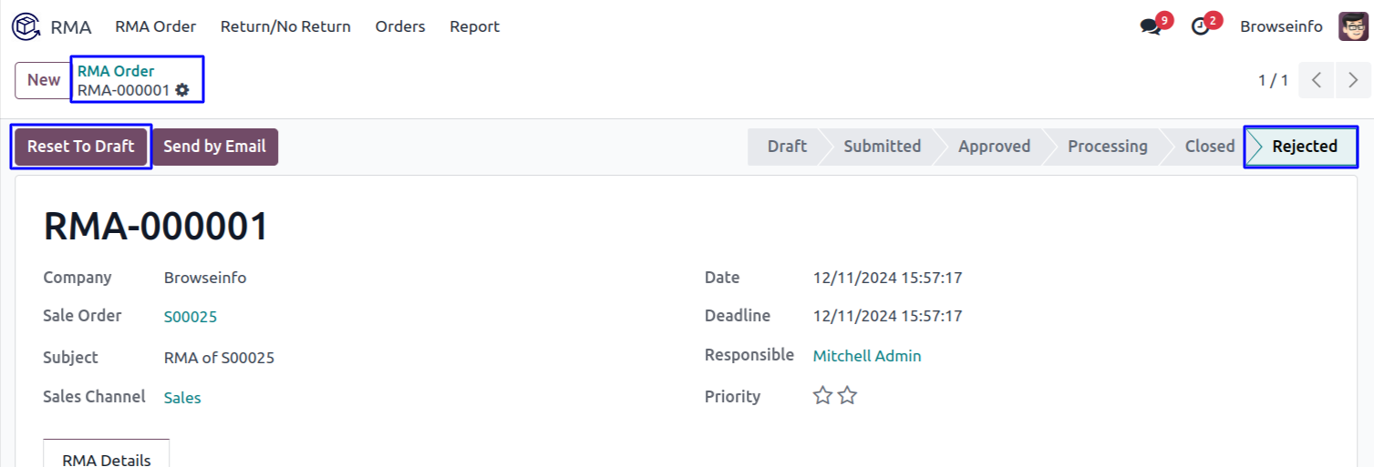 Approver can see RMA is rejected and set to draft RMA order by clicking on 'RESET TO DRAFT' button.