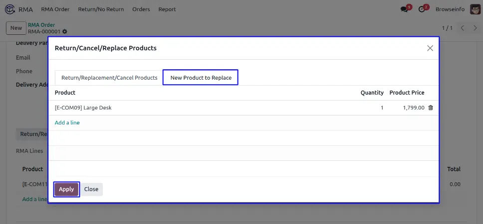 User can set new product to replace with the old product and click on 'APPLY' button.