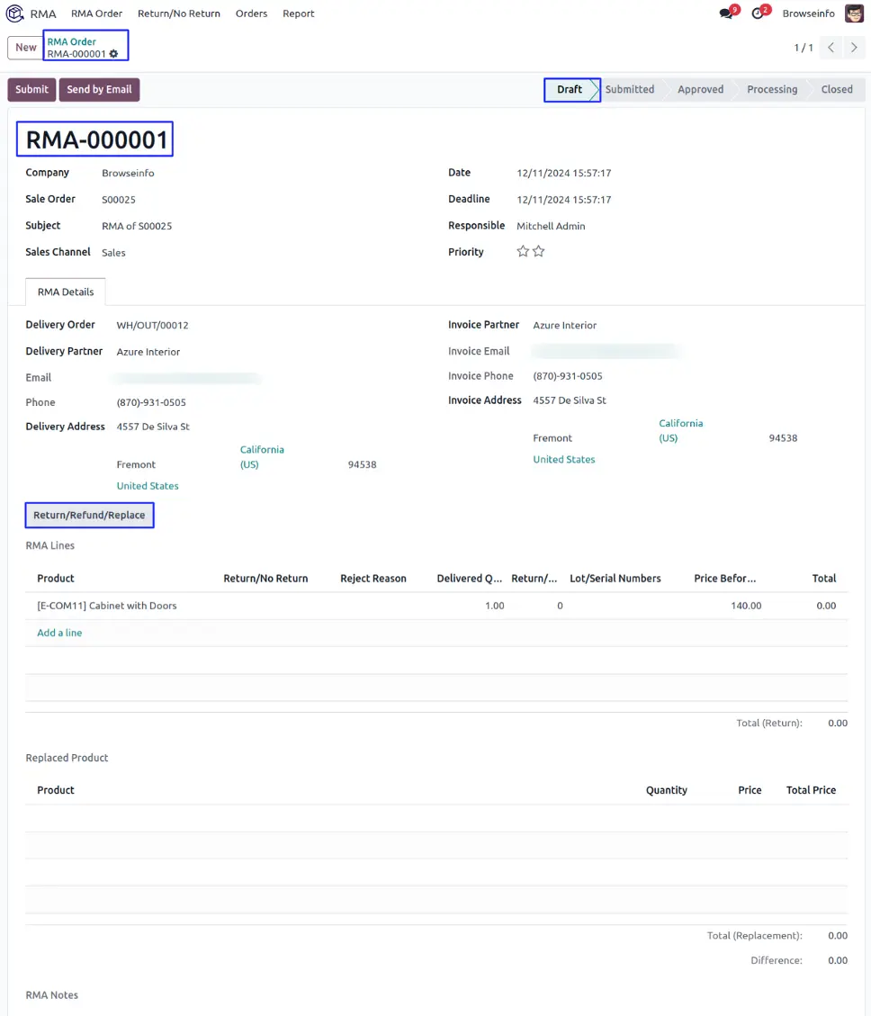 User can see created RMA in form view and return or replace or refund by clicking on 'RETURN/REFUND/REPLACE' button.