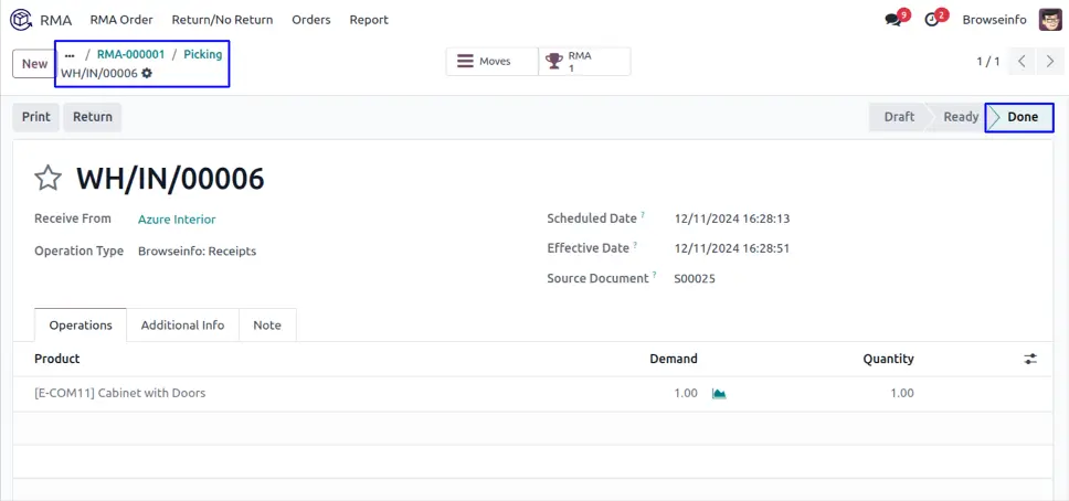 After approved RMA order approver or user can see RMA stage changed to "APPROVED" from "SUBMITTED", and new picking order created for RMA order.