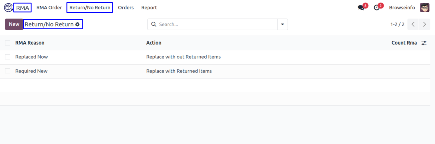 Under RMA > Return/No Return menu user or approver can create reasons for RMA order and set an action according to reason.