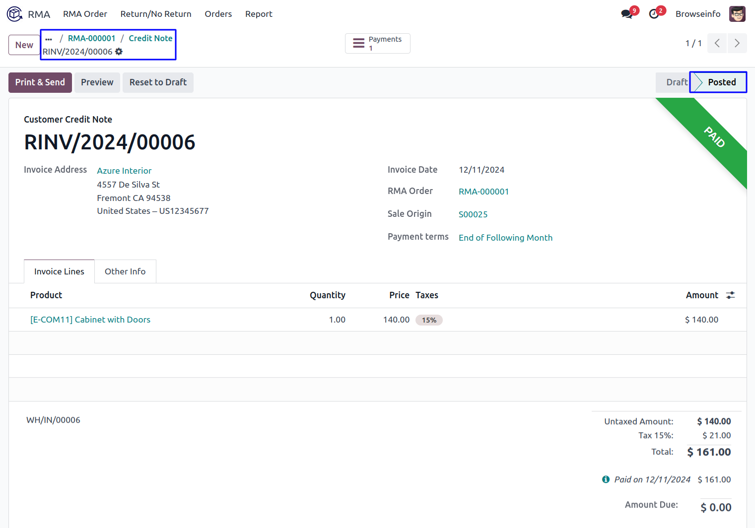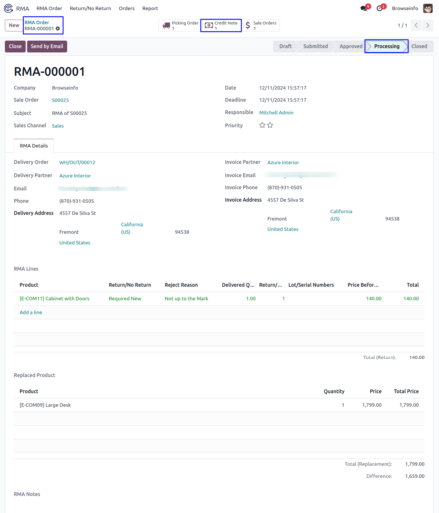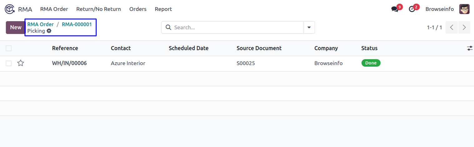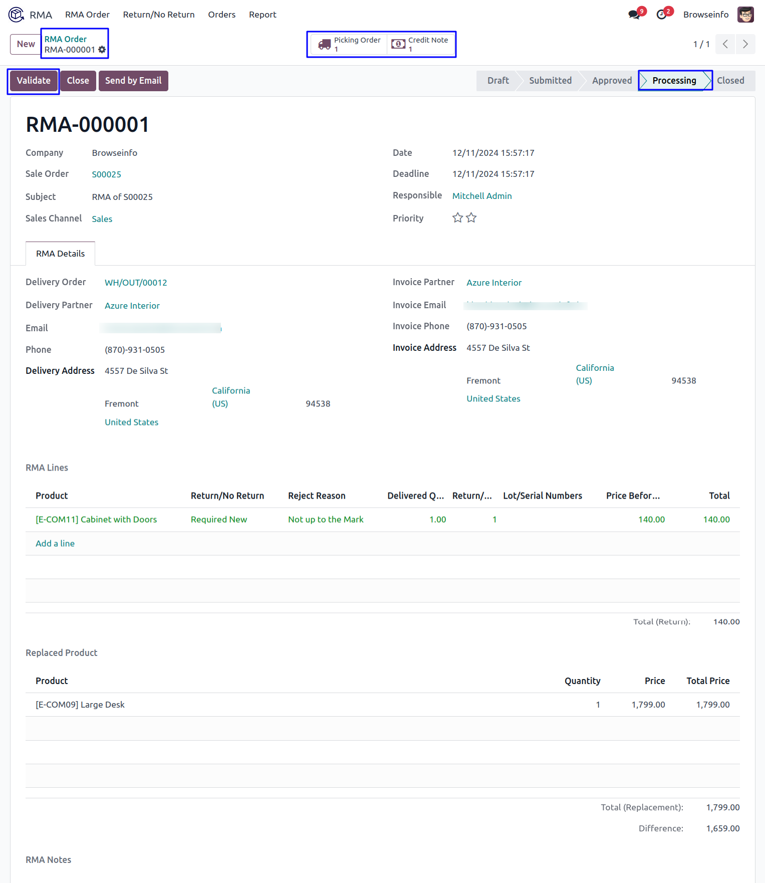 After validate RMA order approver or user can see created picking order and refund invoice for RMA.
