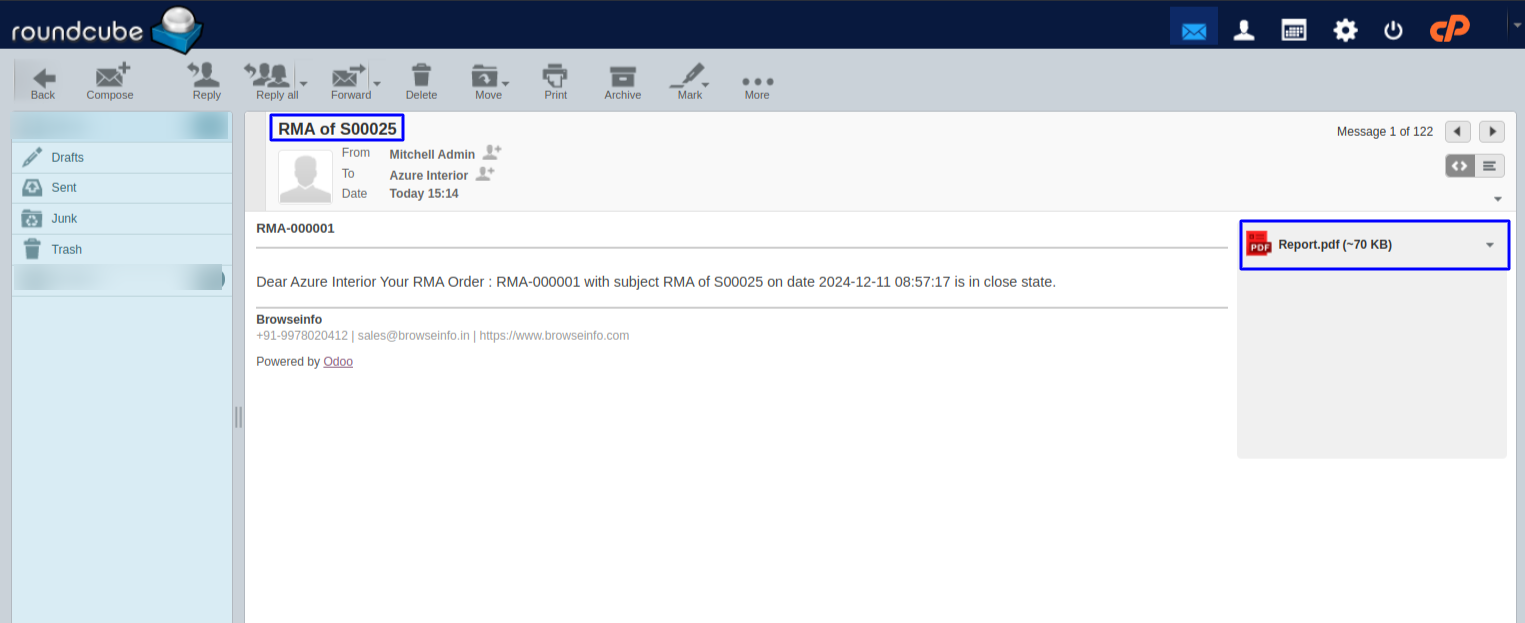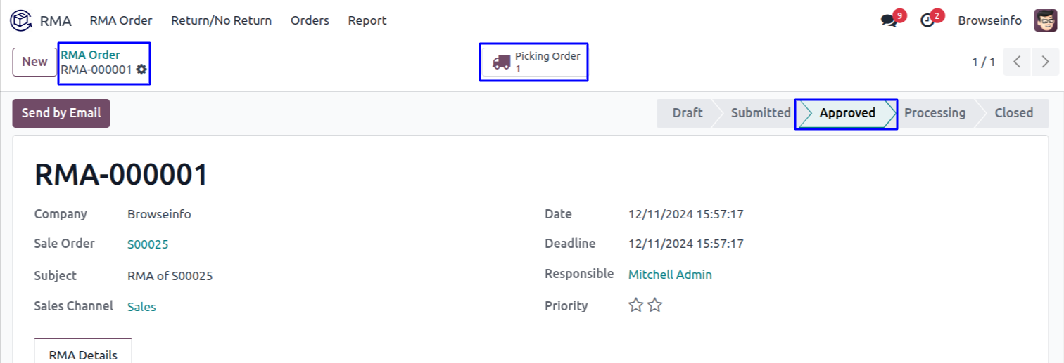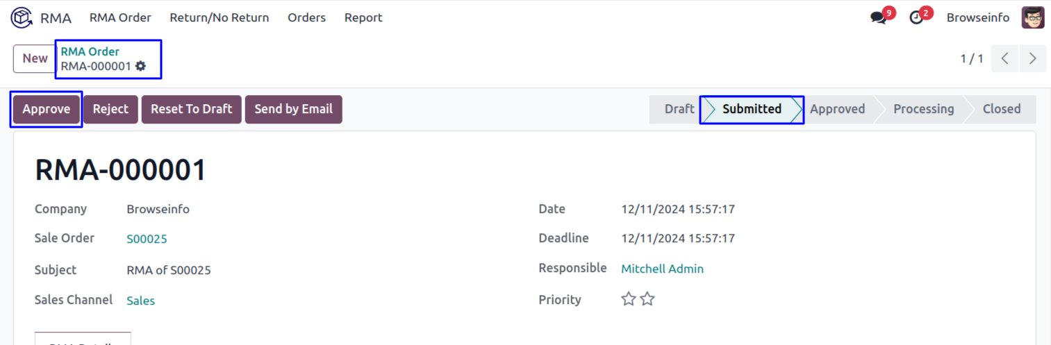 Approver have options to approve, reject, reset to draft and send by email RMA order.