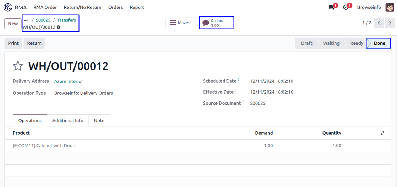 RMA claim will recorded on picking order of selected sale order in RMA order.