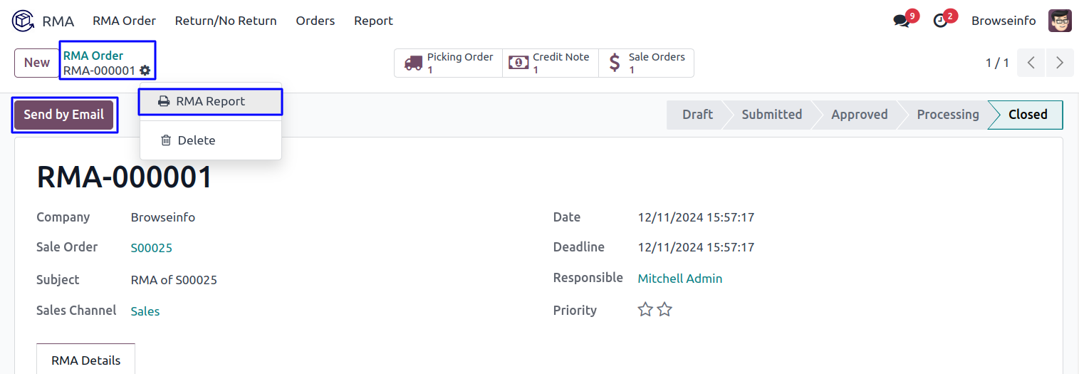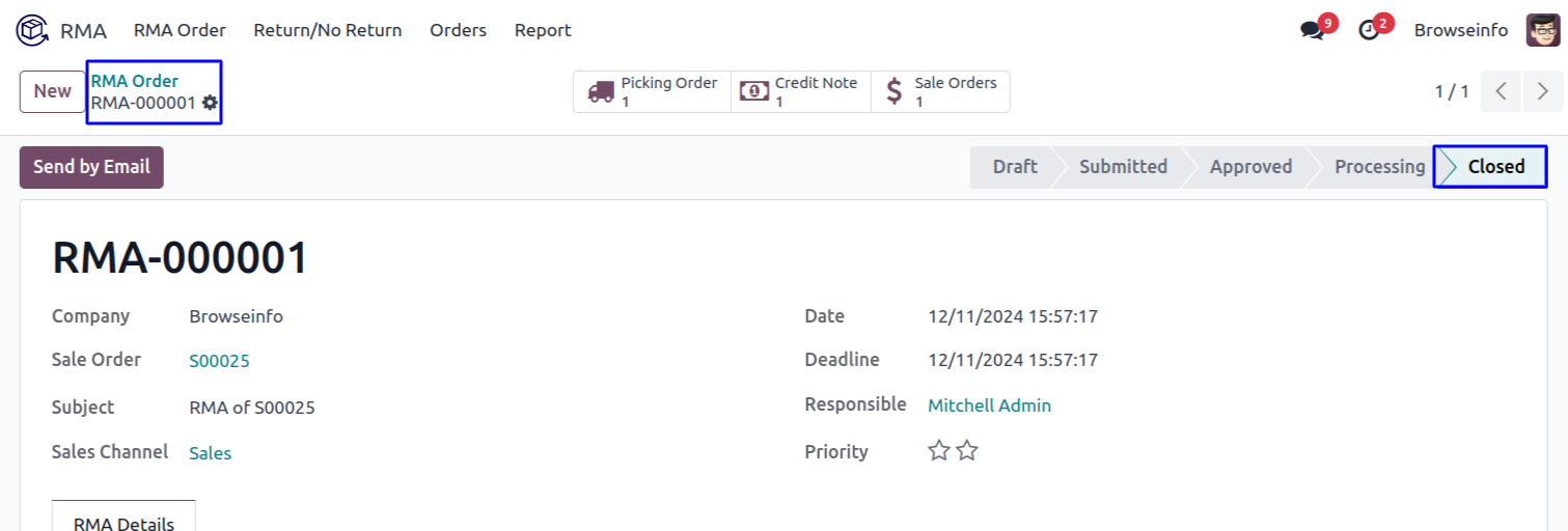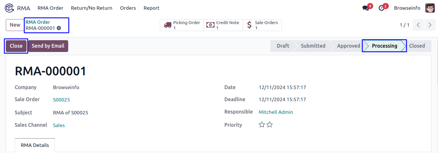 Approver can see RMA order stage changed to "CLOSED" state form "PROCESSING" state.