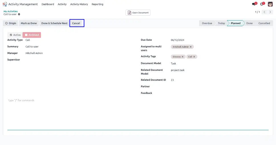 User can cancel activity by clicking "CANCEL" button on activity form view.